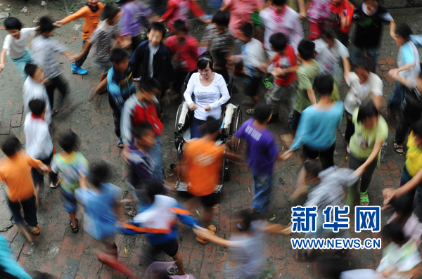 “輪椅”老師的希望 任影在課間與學(xué)生一起做游戲
